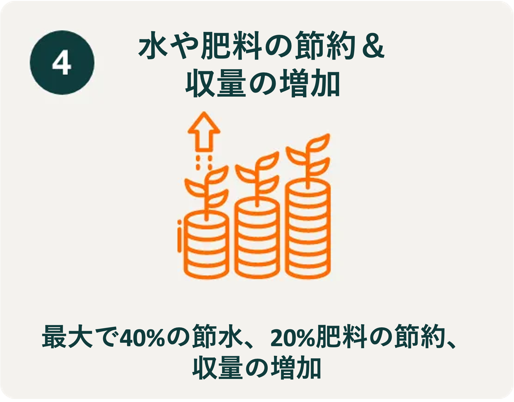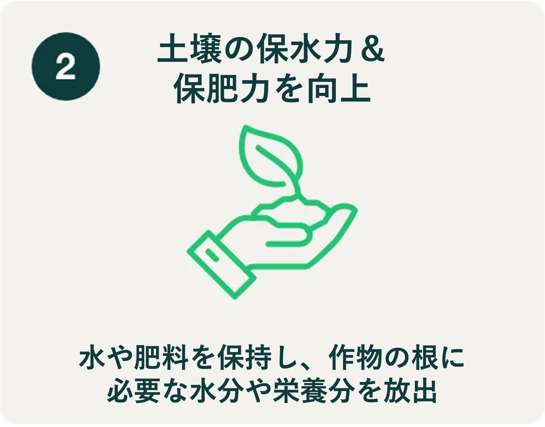 灌水や施肥の頻度が減るので栽培コストの大幅な削減が期待できます。また、土壌の保水力と保肥力が向上することで作物の成長が促進され、収穫量のアップにもつながります。