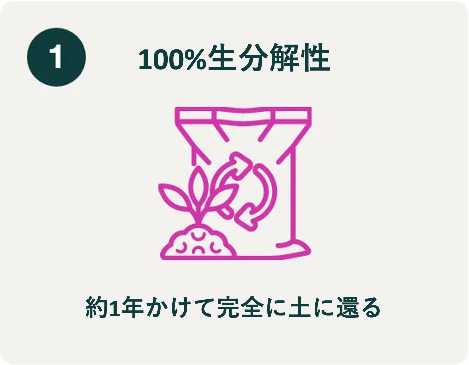 オレンジの皮などの作物残さを原料に作られているので、完全生分解性を有します。ポリマーとしての効果が半年間持続した後、約1年かけてゆっくりと土に還ります。環境に有害な物質を残しません。