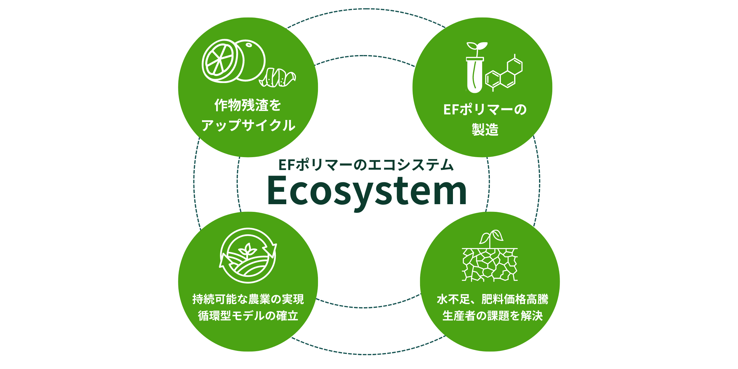 農地で育てられた作物の残渣をさらにアップサイクルされることで、新たなEFポリマーの製造に役立てられます。従来、廃棄されてきた残渣を活用することで廃棄に伴うコストやCO2排出を大幅に削減し、資源の有効活用に貢献します。